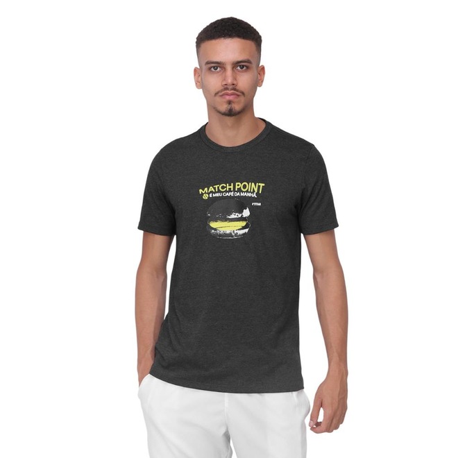 - Detalhamento: Camiseta manga curta, gola careca. A estampa traz a frase Match Point é meu café da manhã acompanhada de uma ilustração estilizada de uma bola de tênis, criando um visual divertido e irreverente que conecta o espírito competitivo do esporte com um toque de humor e lifestyle. Tecido macio e confortável, caimento tradicional;
