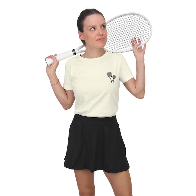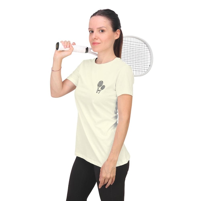 - Detalhamento: Camiseta manga curta, gola careca, com estampa de duas raquetes de tênis na altura do peito no lado esquerdo, tecido macio e confortável, caimento tradicional;