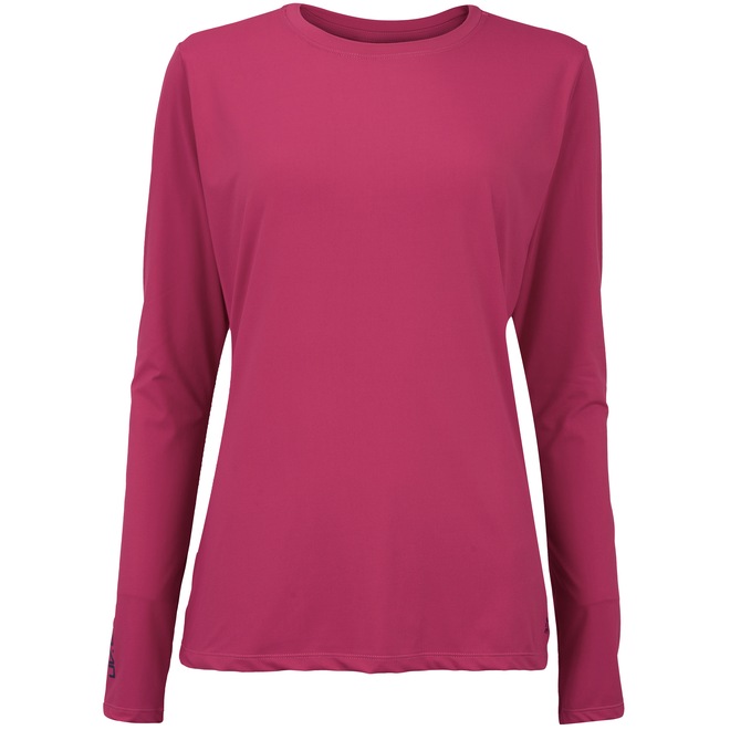 A gola da camiseta Uv Line feminina é careca com tira interna em tecido que ajuda a diminuir o atrito de contato com a costura.