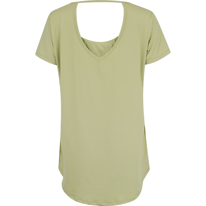 O decote traseiro adiciona charme e ventilação extra, ideal para atividades físicas e looks fitness versáteis.