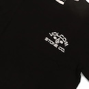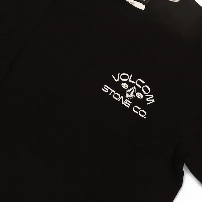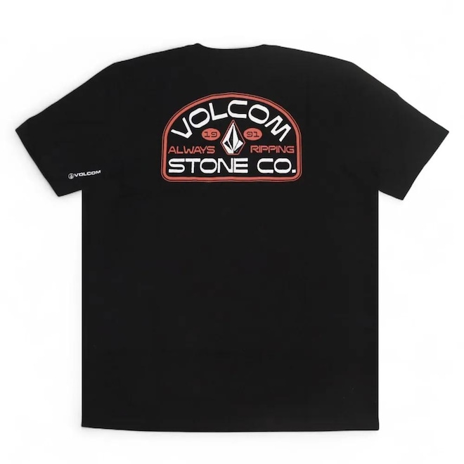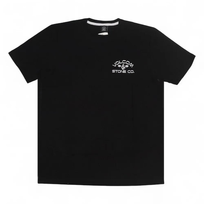 Camiseta Volcom feita em modelagem regular, meia malha 30.1, silk frente e costas, assinatura Volcom na manga, etiqueta interna e viés contrastante.