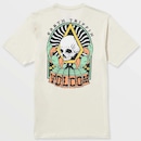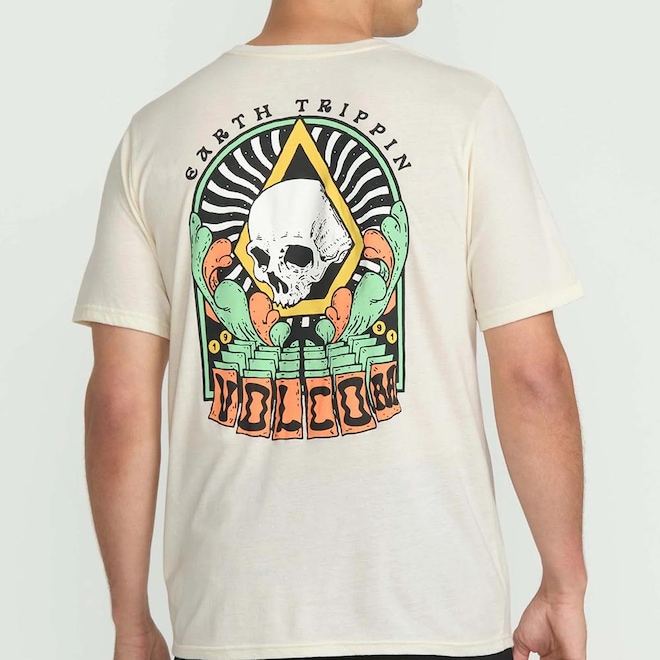 Camiseta Volcom feita em modelagem regular, meia malha 30.1, silk frente e costas, assinatura Volcom na manga, etiqueta interna e viés contrastante.