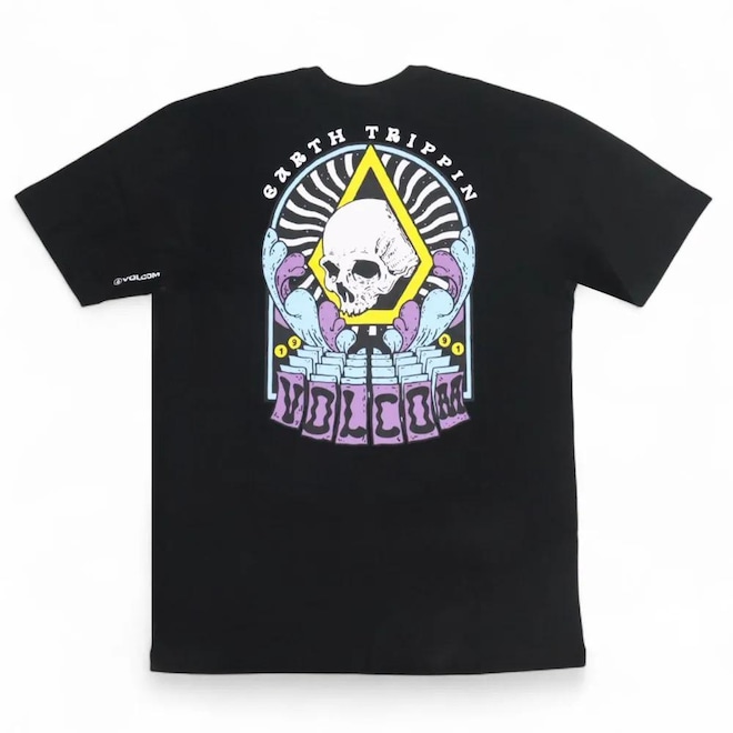 Camiseta Volcom feita em modelagem regular, meia malha 30.1, silk frente e costas, assinatura Volcom na manga, etiqueta interna e viés contrastante.