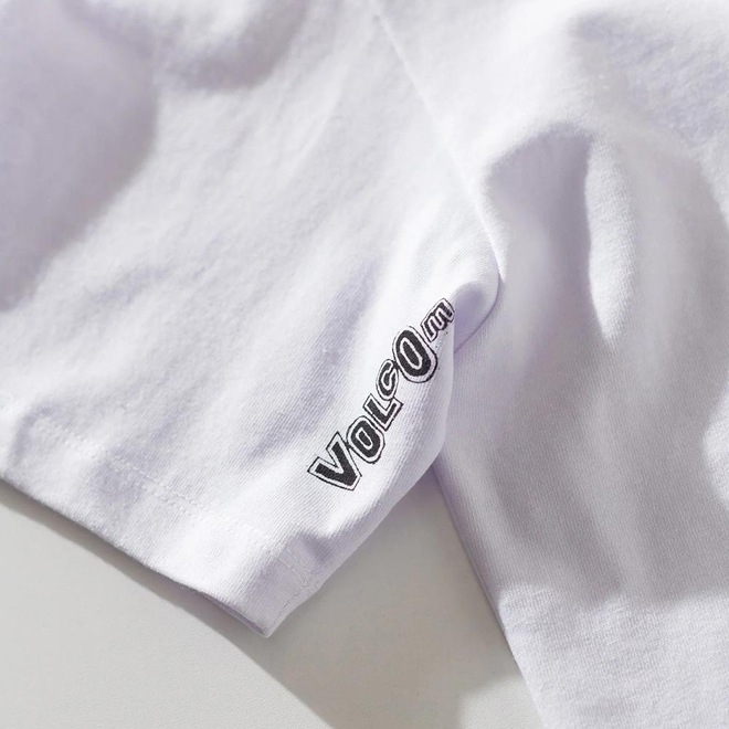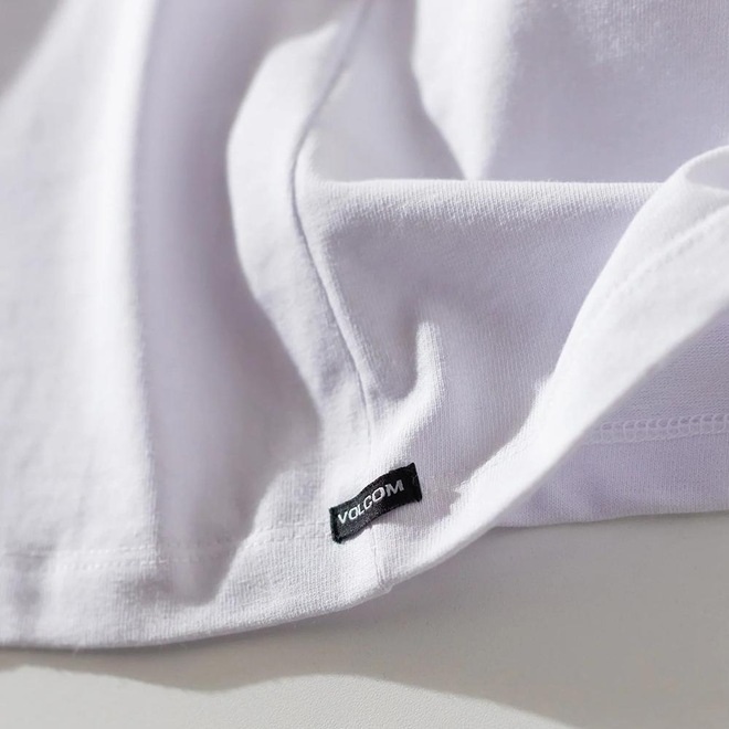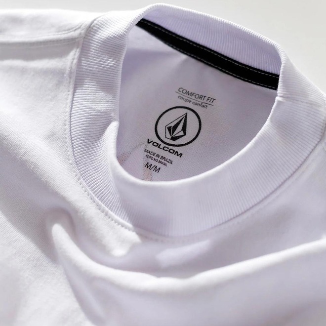 Camiseta Volcom feita em modelagem comfort, gola de 3cm, silk frente e costas, assinatura Volcom na manga, etiqueta Volcom na barra e viés contrastante.