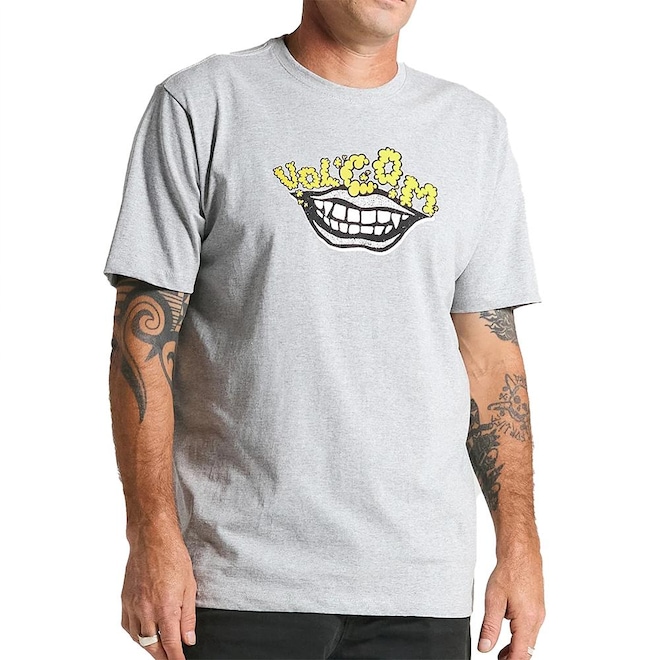 Camiseta Volcom feita em modelagem regular, meia malha 30.1, silk frontal, assinatura Volcom na manga, etiqueta interna e viés contrastante.