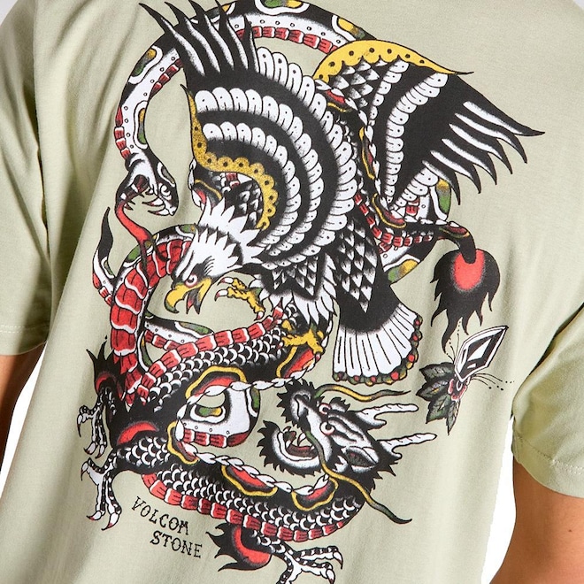 Camiseta Volcom feita em modelagem regular, meia malha 30.1, silk frente e costas, assinatura Volcom na manga, etiqueta interna e viés contrastante.
