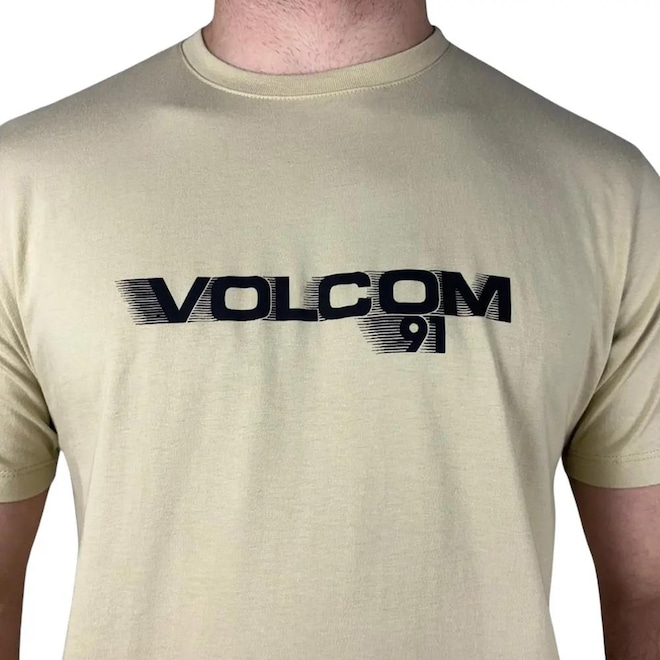 Camiseta Volcom feita em modelagem regular, meia malha 30.1, silk frontal, assinatura Volcom na manga, etiqueta interna e viés contrastante.
