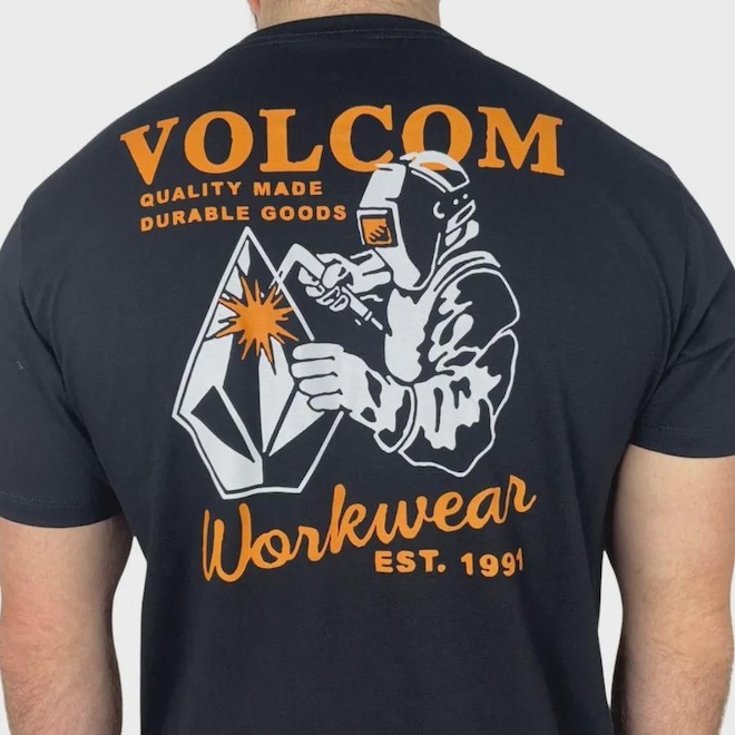 Camiseta Volcom Workwear Welder. Possui modelagem regular, estampa em silk frontal e nas costas, assinatura Volcom na manga, etiqueta interna e viés contrastante.