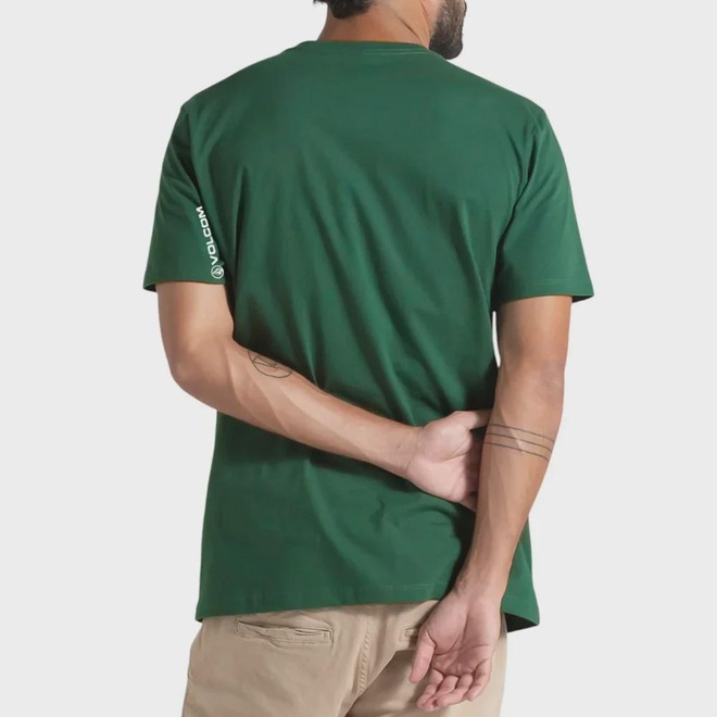 Camiseta Volcom Solid Stone. Possui modelagem regular, estampa em silk Circle Stone na manga, assinatura Volcom na manga, etiqueta interna e viés contrastante.