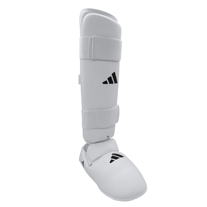 Segurança e conforto, a caneleira e o protetor de pés são peças separadas, que podem se unir através de velcro resistente, mantendo todos os movimentos,, fabricada em EVA revestida por PU (sigla para Poliuretano, um polímero resistente a rasgos e com grande elasticidade e resistência) ela possui fitas de aderentes de dupla face para regulagem. O tamanho adequado, não deve permitir que a caneleira deslize facilmente, e também não deve apertar em demasia a tíbia e o pé do atleta.
