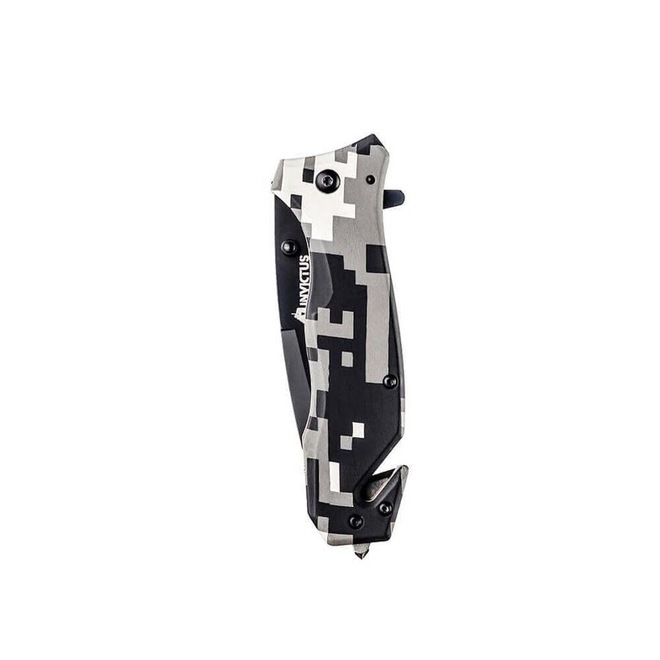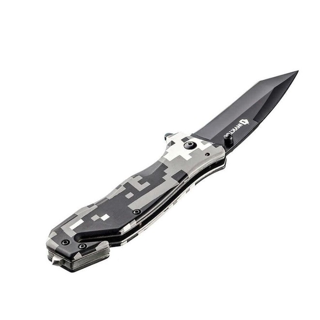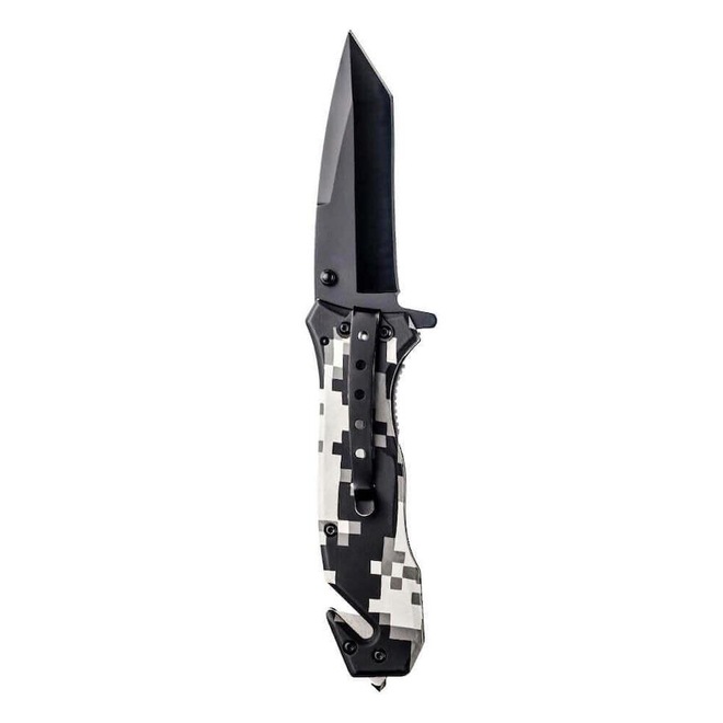 Possui lâmina em aço inoxidável 420, de maior resistência a impactos e maior durabilidade, cabo em óxido de alumínio com camuflado digital urbano, clip tático, pomo metálico (quedra vidro), corta cinto no cabo e abertura fácil e rápida assistida por mola (spring assisted).