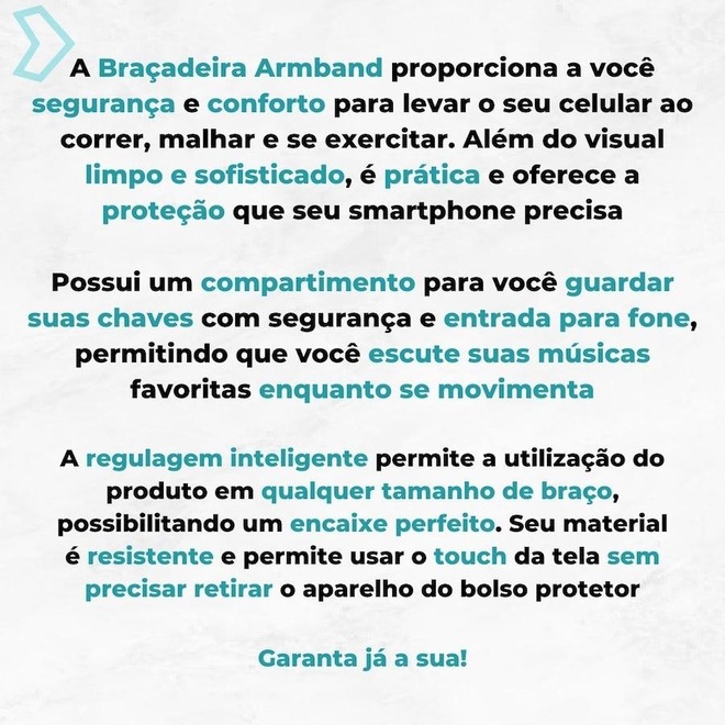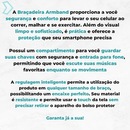 SOBRE O PRODUTO: A Braçadeira Armband proporciona à você segurança e conforto para levar o seu celular ao correr, malhar e se exercitar. Além do visual limpo e sofisticado, é prática e oferece a proteção que seu smartphone precisa. Segurança em primeiro lugar: Com a Braçadeira Armband você consegue realizar tanto as tarefas do dia a dia, quanto se exercitar como quiser, transportando sempre o seu smartphone protegido com você. Bolso para chave: Compartimento para você guardar suas chaves com segurança! Entrada para fone: A braçadeira possui uma entrada para fones, permitindo que você escute suas músicas favoritas enquanto se movimenta Características do produto: A Braçadeira é feita em neoprene, poliester e polietileno. Possui regulagem inteligente que permite a utilização do produto em qualquer tamanho de braço, possibilitando um encaixe perfeito. Seu material é resistente permite a você atender a ligações e usar o touch da tela sem precisar retirar o aparelho do bolso protetor da capa. Para celulares de até 5.5 polegadas.