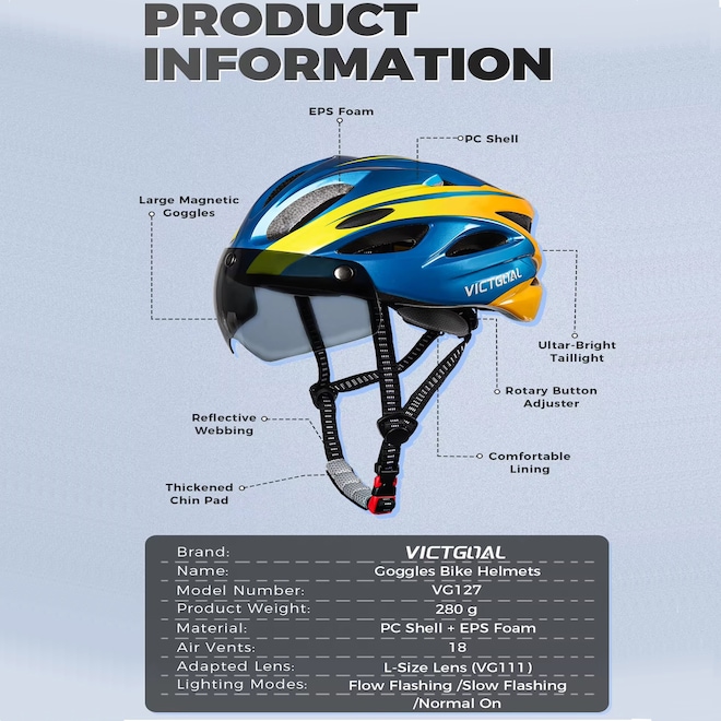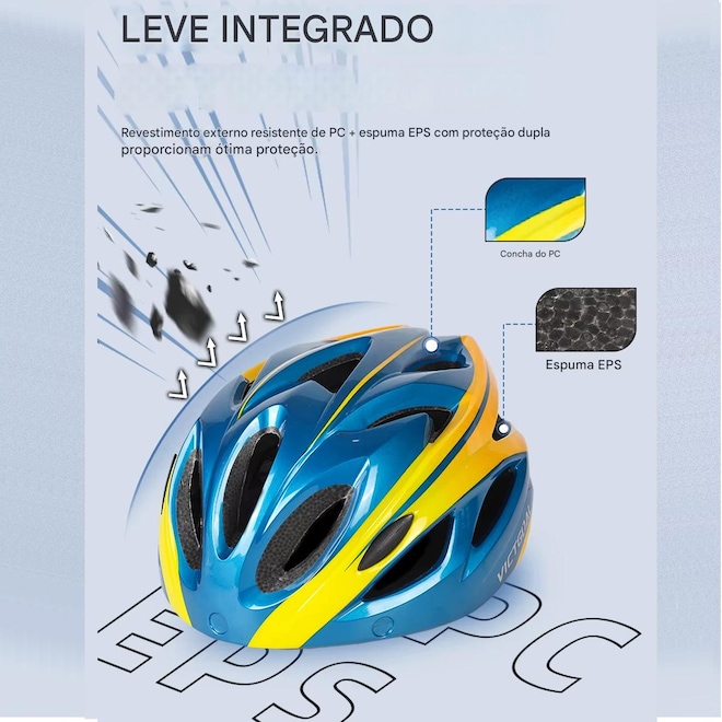 O Capacete para Ciclismo Gold Sports Victgual - Ultra Leve, possui um projeto arrojado e inovador, confeccionado em EPS material de alta qualidade, o que faz ele seguro e ultraleve, tem viseira luzes para o uso urbano e em estrada com 5 modos diferentes acompanha carregador usb e suporte para câmera. projetado com uma aerodinâmica inovadora o reduz muito a resistência do ar, possui 15 aberturas para manter sua cabeça ventilada diminuindo muito o suor. Ideal para ciclismo urbano, estradeiro. Possui Viseira que pode ser acoplada ou não e regulagem tipo engrenagem para ajustar melhor na cabeça, possui viseira magnética com proteção UV400 e lanterna acoplada na parte traseira e um design ARROJADO E MODERNO.