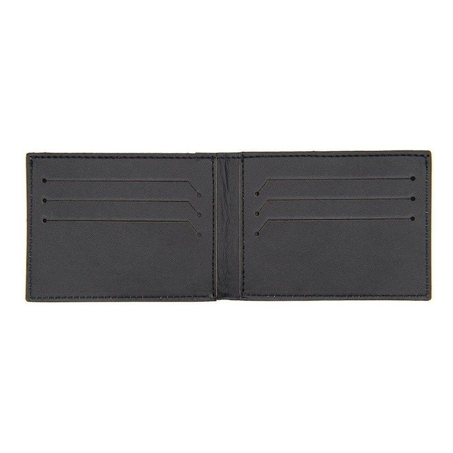 Carteira horizontal em material não natural, patch elíptico com gravação a laser, gravação a laser externa e interna, compartimento para notas, divisor de cartões e etiqueta personalizada.