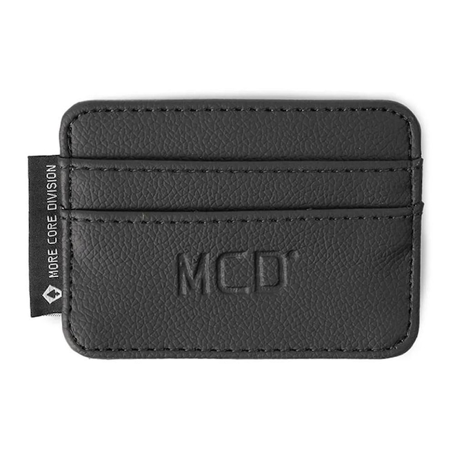 Carteira MCD feita em poliuretano, compartimento principal, múltiplos espaços para cartões e etiqueta personalizada.