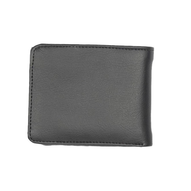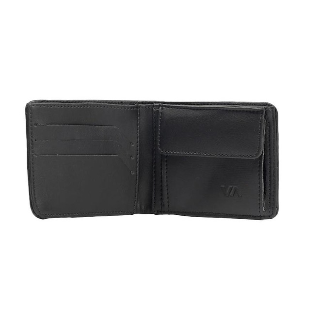 Carteira RVCA de material não natural com duas partes, três compartimentos para cartão, compartimento para dinheiro, bolso interno com lapela e logo RVCA gravado centralizado na frente.