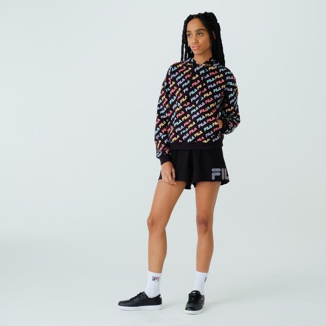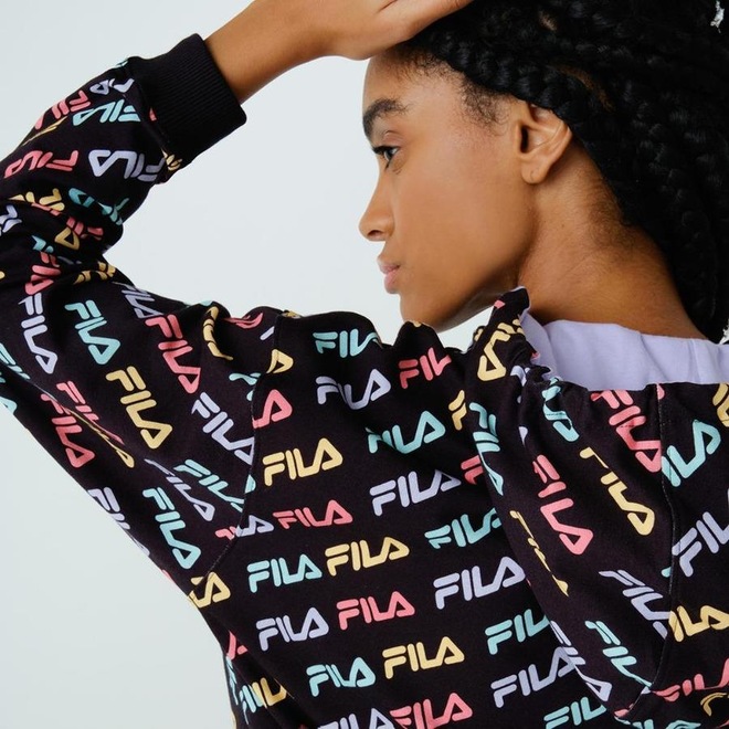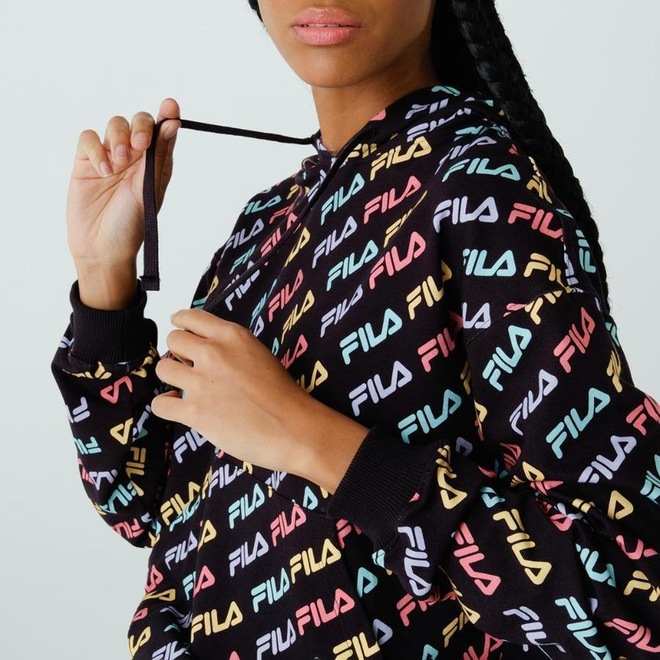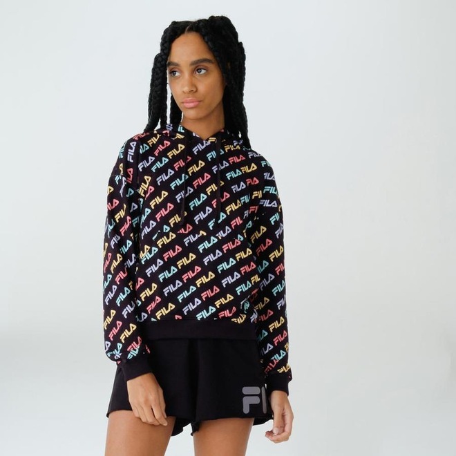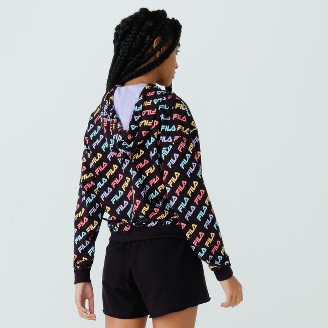 Casaco com capuz feminino confeccionado em moletinho leve de algodão e elastano. Modelagem regular com manga longa. Possui logomania colorida de Fila Letter full print, capuz forrado em meia malha de algodão contrastante com cordão ajustável, bolso canguru frontal, punhos e barra em ribana, cobre gola institucional e acabamentos pespontados. ESTAMPADO COLORIDOref: M0ZW3C