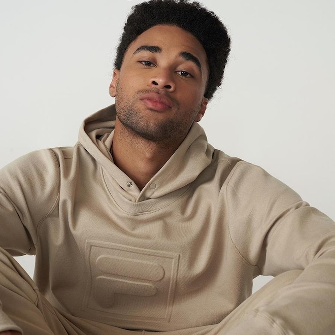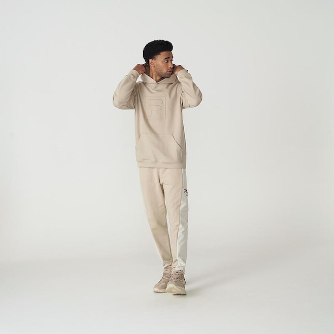 Possui gola em ribana sobreposta ao capuz, punhos e barra em ribana, capuz com ajuste em botões de pressão, ilhós bordados aplicados abaixo da manga para maior respirabilidade, maxi logo F-Box em relevo centralizado na parte frontal e patch Fila Stack aplicado na parte traseira próximo à gola.