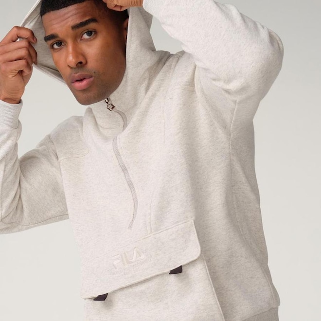 Casaco Anorak com capuz masculino confeccionado em moletom felpado de algodão e poliéster. Modelagem comfort, mais solta no corpo, com manga longa. Possui abertura frontal em meio zíper com puxador personalizado F Floating vazado, capuz com recorte anatômico pespontado, bolso frontal com fechamento em velcro e aberturas laterais, punhos e barra em ribana, cava deslocada, recortes simétricos na parte frontal, logo Fila Letter bordado na lapela do bolso frontal, pala traseira e etiqueta personalizada Street Express centralizada na parte traseira abaixo da pala.