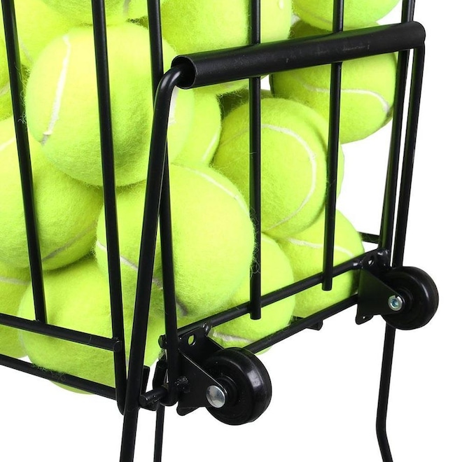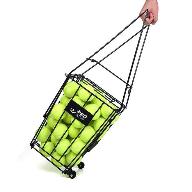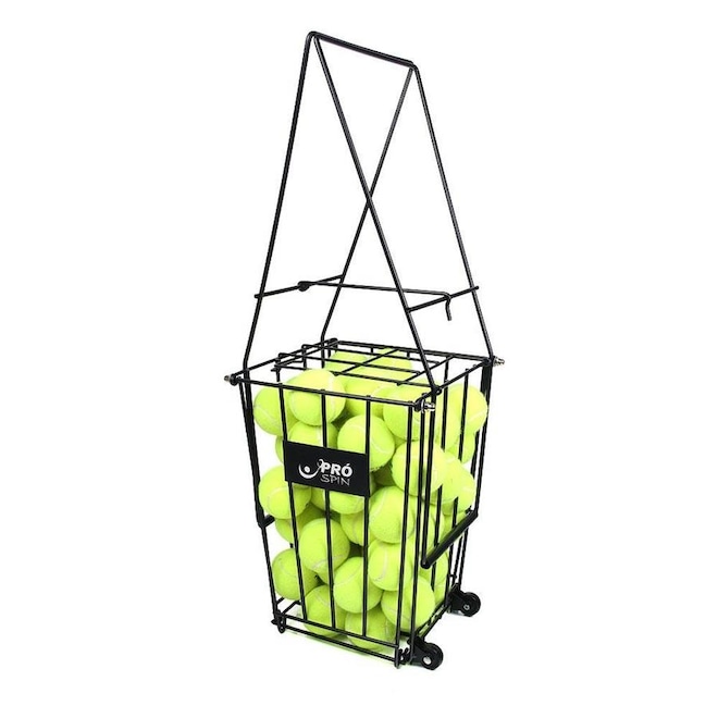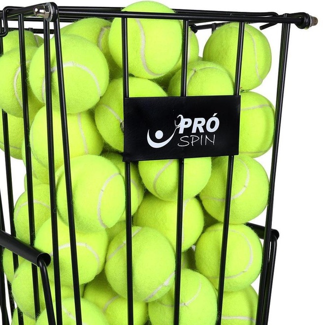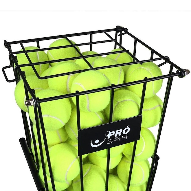 - Detalhamento: Acomoda até 60 bolas, possui rodinhas, alças que se transformam em pés quando necessário facilitando o transporte e deixando a cesta estável. Suas grades possuem espaçamentos entre si que não permite que você perca suas bolas. Possui tampa , sendo de uso opcional. Escrita e logo Pró Spin em ambas as faces. Não acompanha coletor;