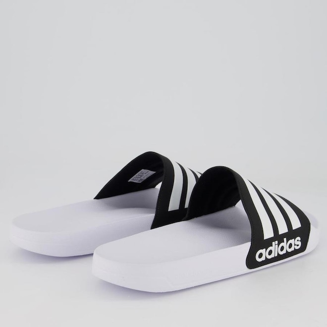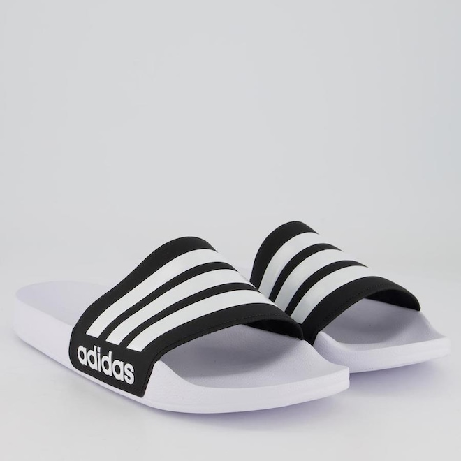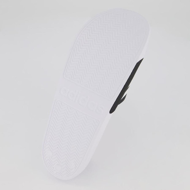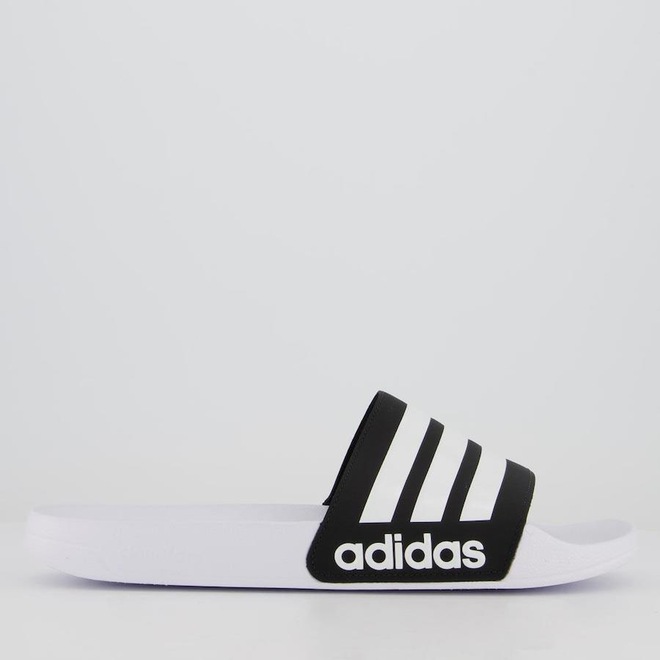 O logo e as Três Listras da adidas completam o icônico estilo Adilette.