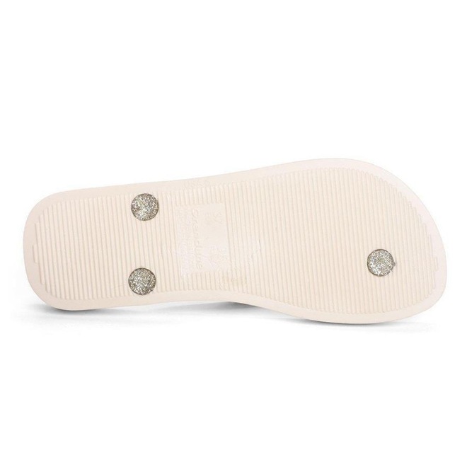 Ele é confeccionado com uma sola de borracha macia, que proporciona amortecimento e flexibilidade durante o uso. A tira superior é feita de material sintético e possui um acabamento com glitter, o que confere um brilho delicado e charmoso ao chinelo.
