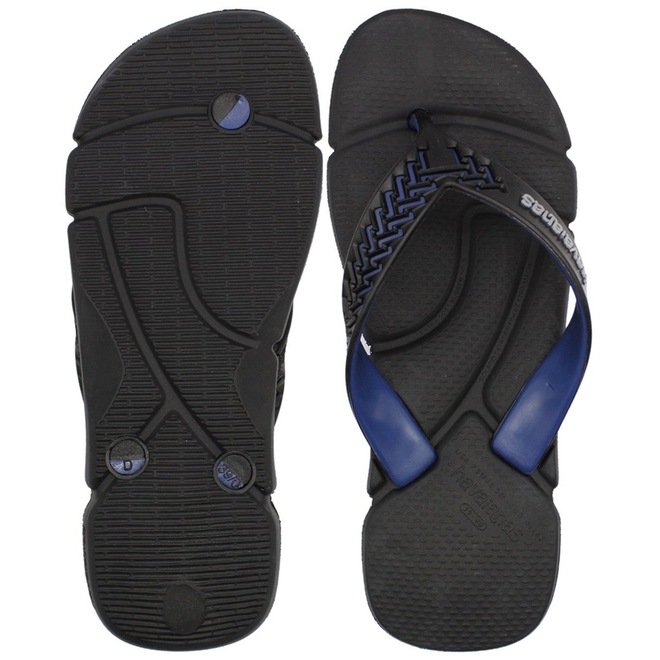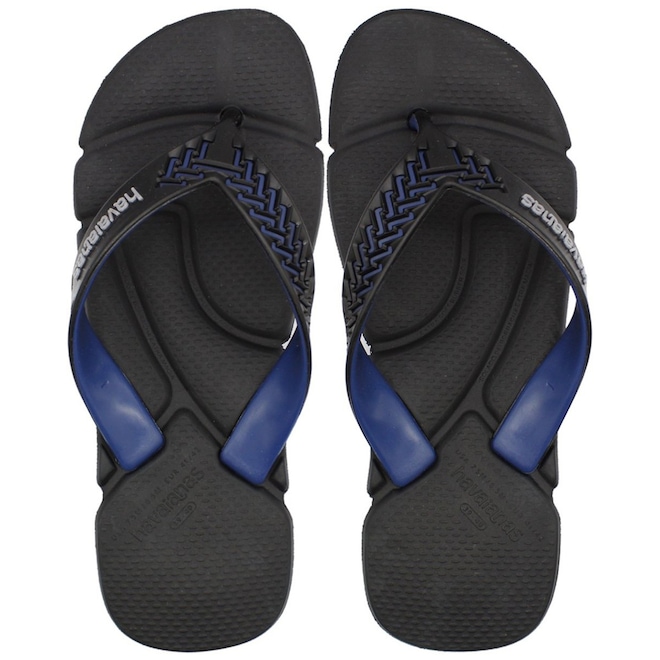 Tiras trançadas em preto e azul com logo "Havaianas" em branco