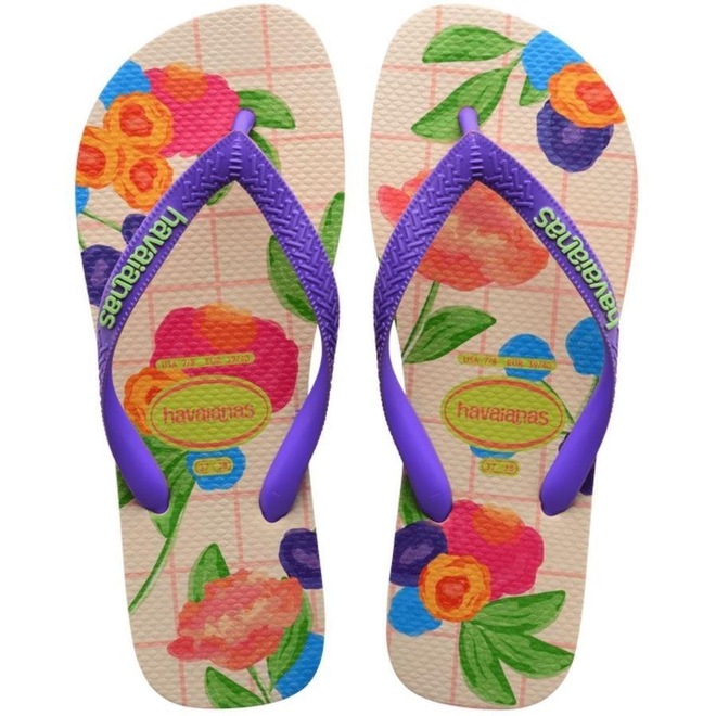 A Havaianas Top Floral Fresh é linda! A estampa floral aquarelada é aplicada sobre uma base quadriculada.
