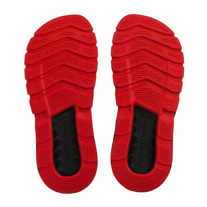 Seu solado conta com a peça amplificadora Re.Amp, que promove elevação a cada passo, com design megatratorado de borracha vulcanizada, oferecendo assim melhor adaptação e firmeza em diversos ambientes, desde o molhado até o mais arenoso.