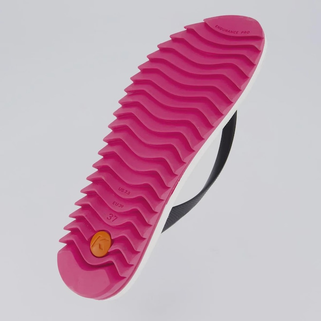 Tecnologia Endurance Pro: Solado supertratorado construido em borracha vulcanizada que promovendo mais segurança a cada passo Composição: EVA Origem: Nacional Gênero: Feminino Indicado para: Casual Cor predominante: Rosa Tira: Fina e divisora de dedos Solado: Borracha tratorada e antiderrapante Composição tira: Material sintético Peso aproximado: 400g o par n° 37