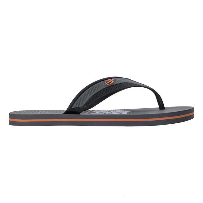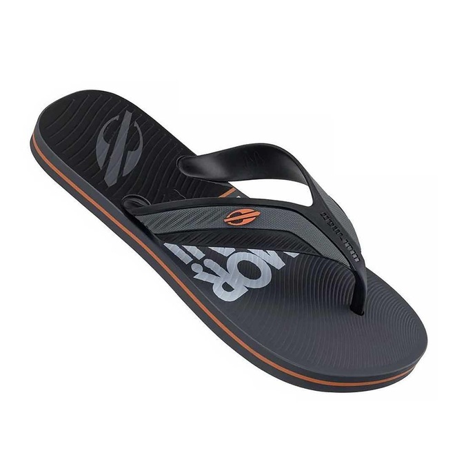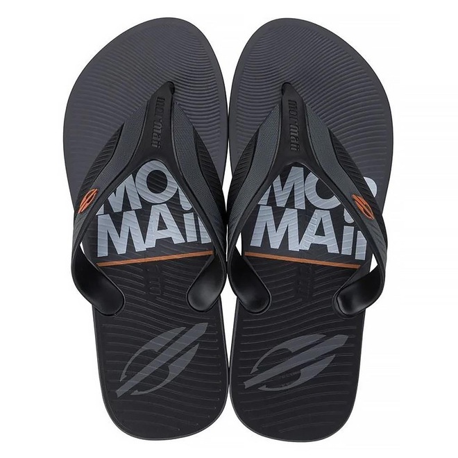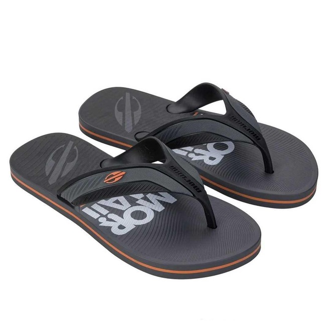 Grafite e preto no solado e tiras, com detalhes em laranja e marca Mormaii em branco