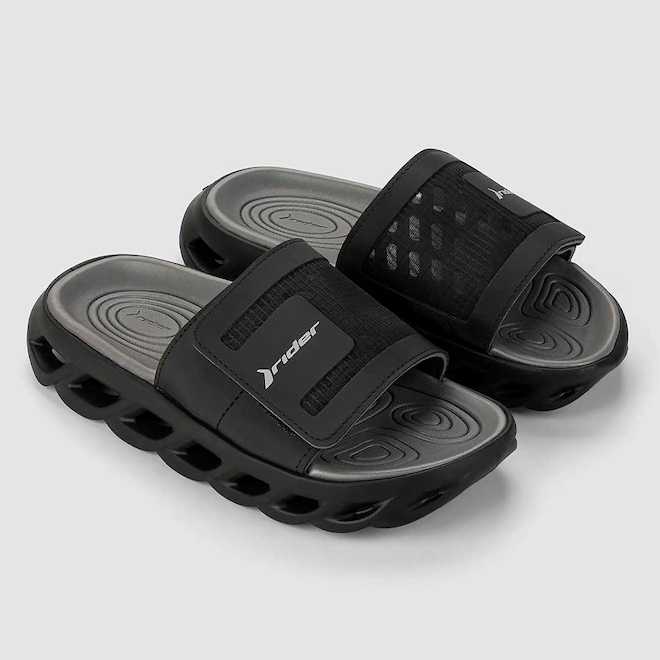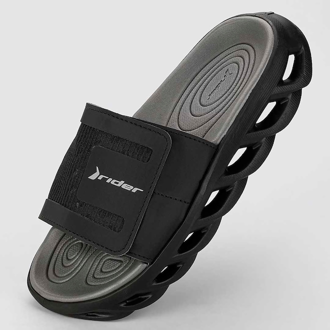 Palmilha e tela da tira em cinza. Contorno da tira e solado em preto, com a marca Rider em branco