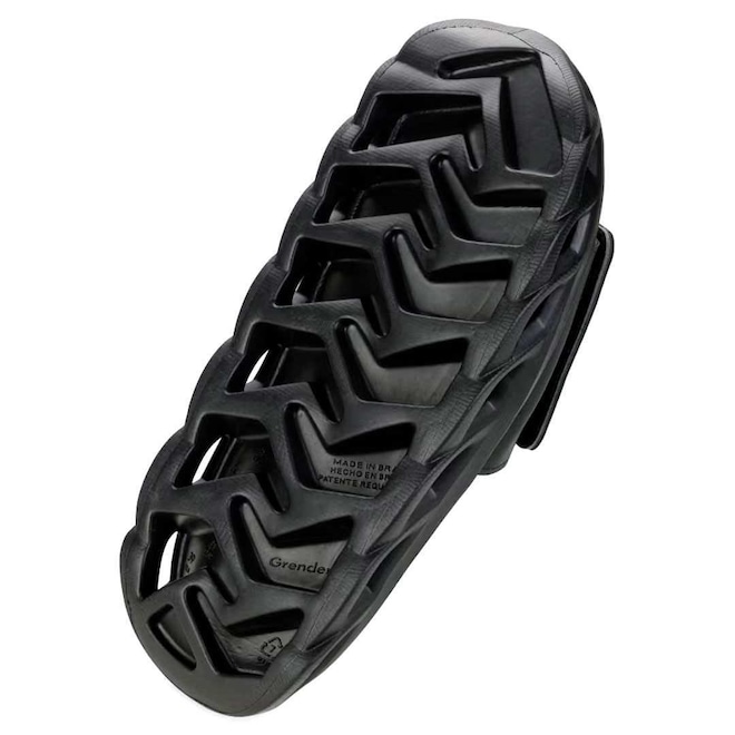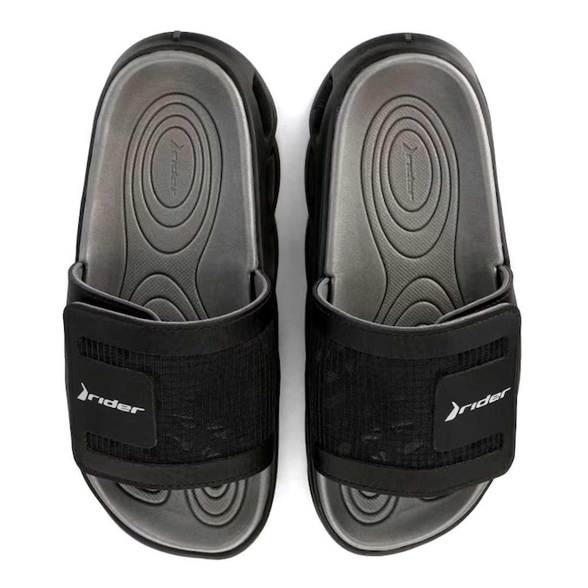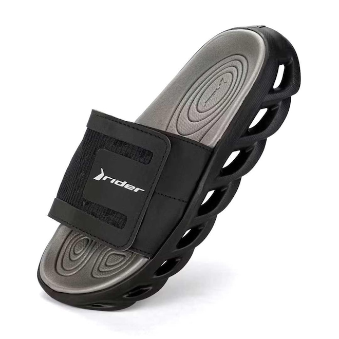 Palmilha e tela da tira em cinza. Contorno da tira e solado em preto, com a marca Rider em branco