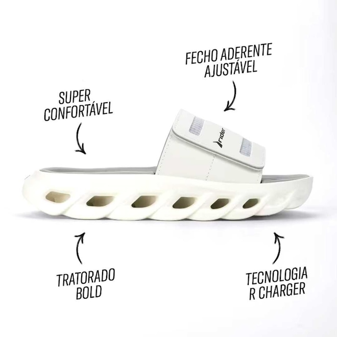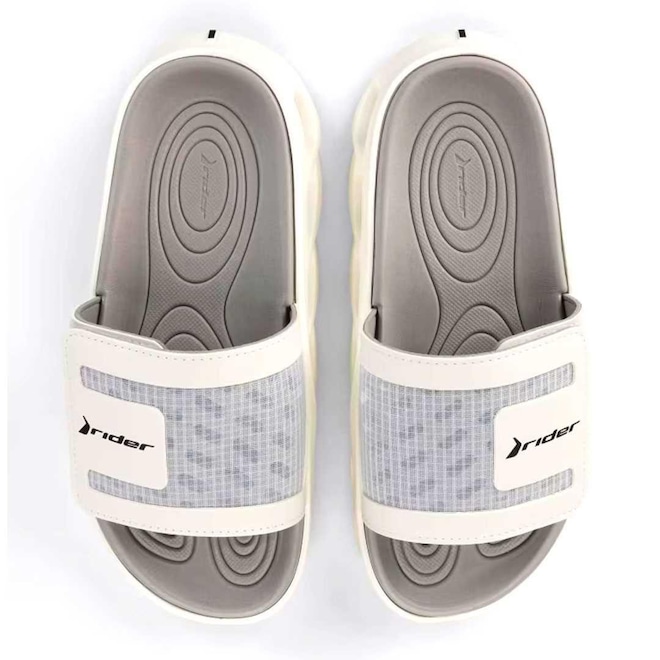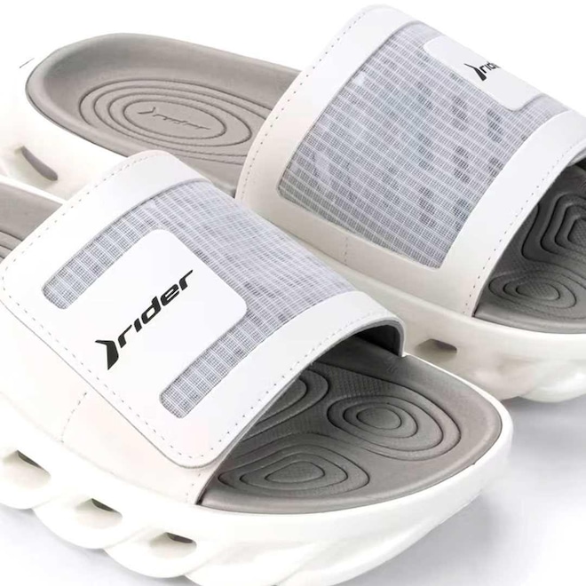 Palmilha e tela da tira em cinza. Contorno da tira e solado em branco gelo, com a marca Rider em preto.