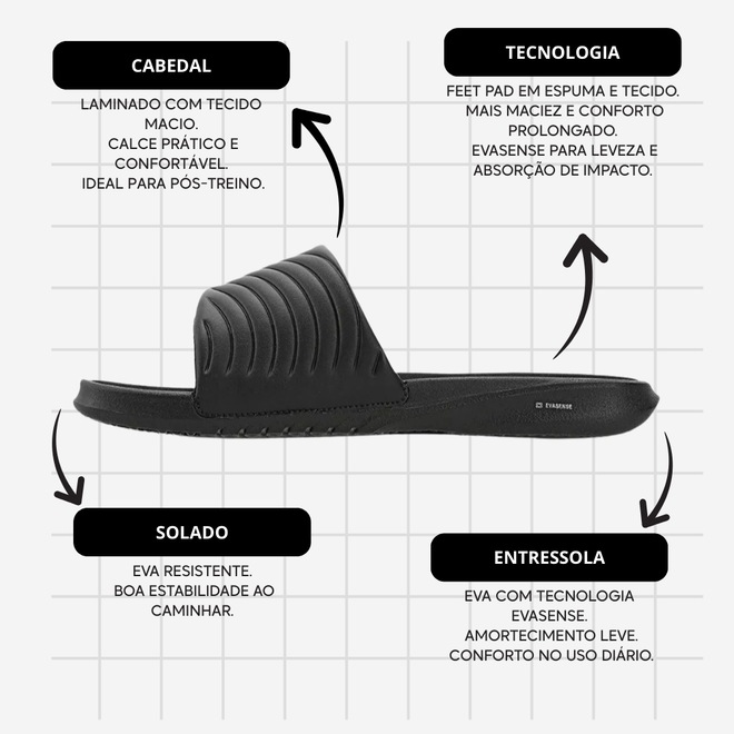 - Feet Pad: palmilha em espuma que proporciona maciez e conforto durante o uso.