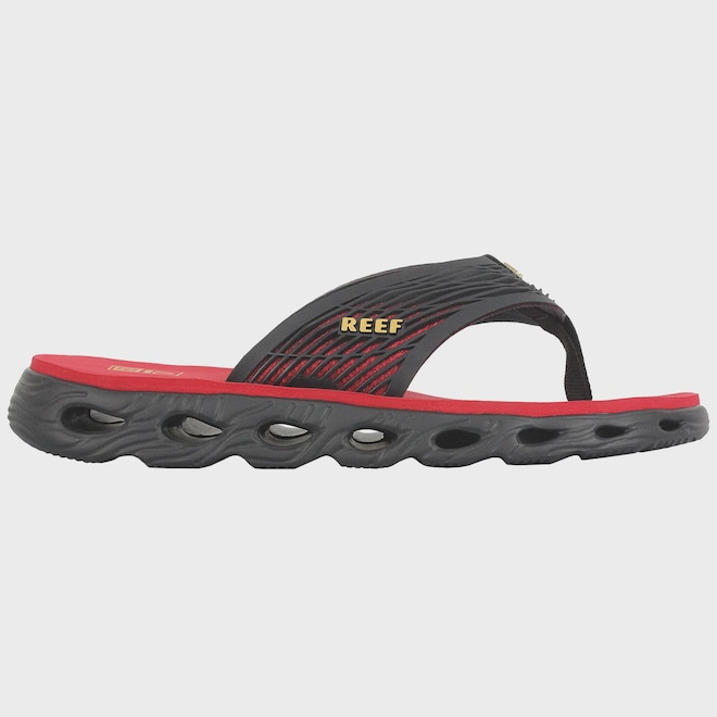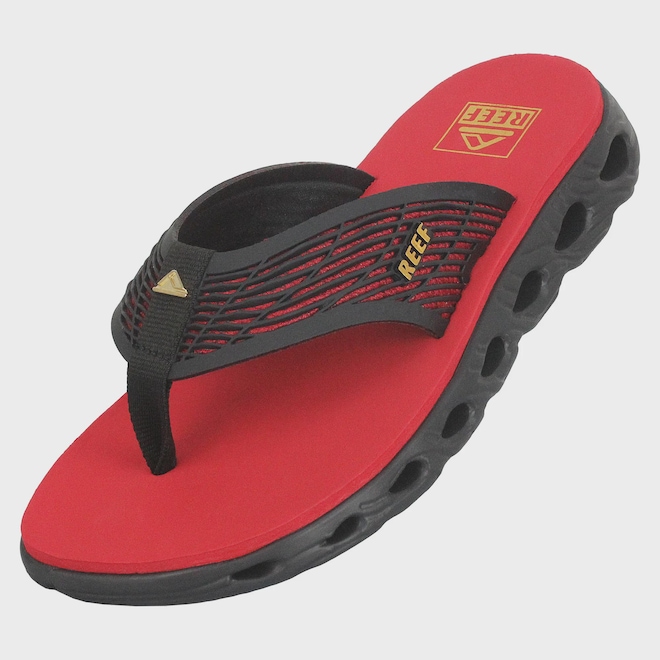 O Chinelo Reef Vision Black Red tem as tiras largas, produzidas em TPU com forração interna que garante conforto e reistência, palmilha produzida em EVA soft touch com 7mm de espessura. Logo Reef apresentado em Pin metálico na tira , solado vazado em EVA injetado que garante leveza e ótima tração.