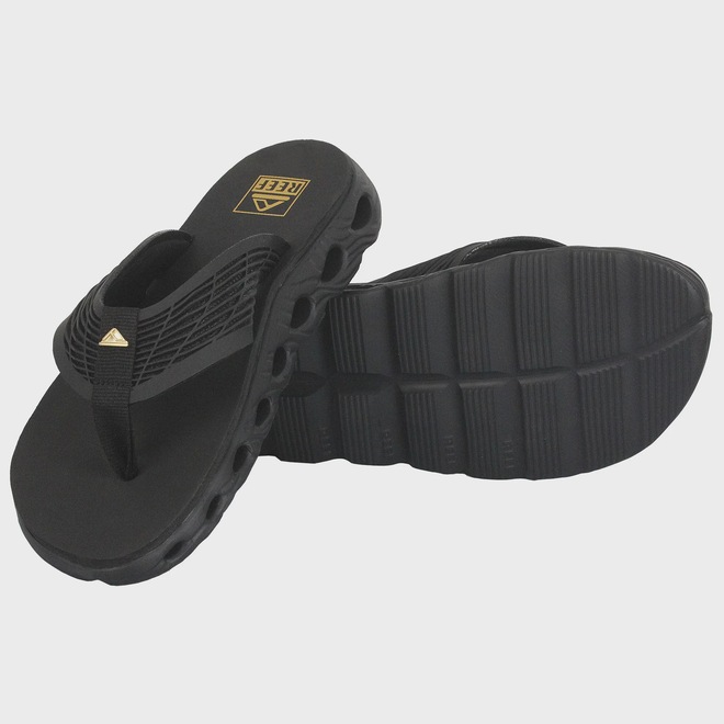 O Chinelo Reef Vision Black Gold tem as tiras largas, produzidas em TPU com forração interna que garante conforto e reistência, palmilha produzida em EVA soft touch com 7mm de espessura. Logo Reef apresentado em Pin metálico na tira , solado vazado em EVA injetado que garante leveza e ótima tração.