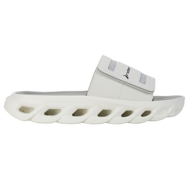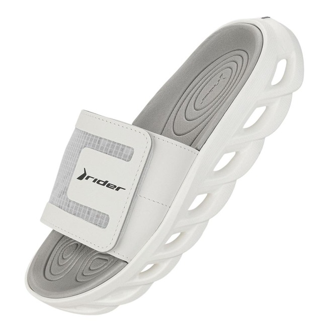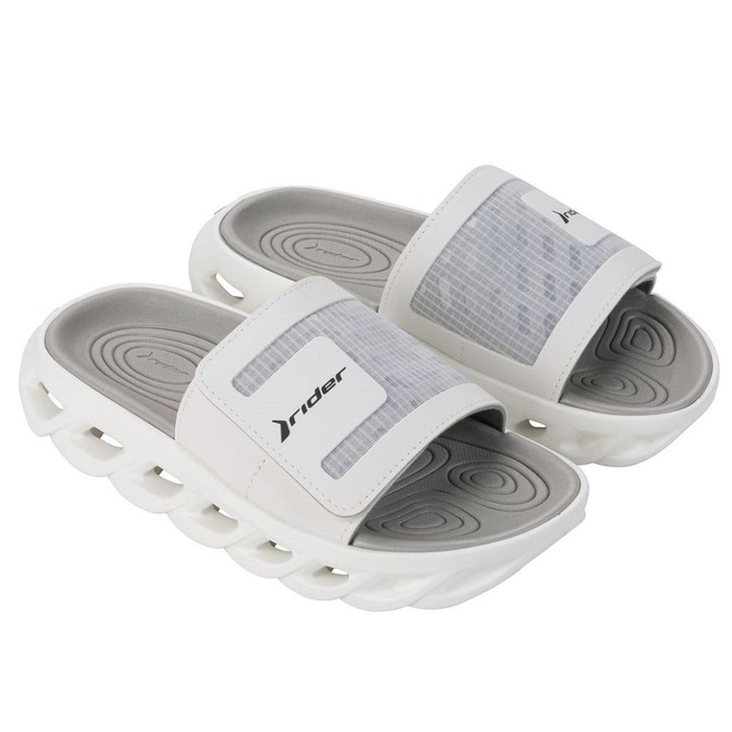 O Rider R Power Slide une tendência com tecnologia, trazendo o que há de melhor nos chinelos slides para você. O destaque desse modelo está na sola, que traz um tratorado bold, remetendo aos systems volumosos dos sneakers dos anos 2000, visual que têm mostrado força novamente no sportswear. E na parte de baixo, o play de Rider marca cada pisada com muito estilo e identidade. O R Power é o companheiro ideal para os fazedores de Rider. Além disso, a palmilha traz conformagem marcando uma pisada anatômica diferenciada e texturas que deixam o visual high tech, fazendo o complemento perfeito para a proposta moderna desse produto.