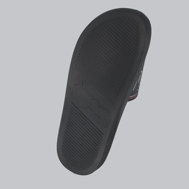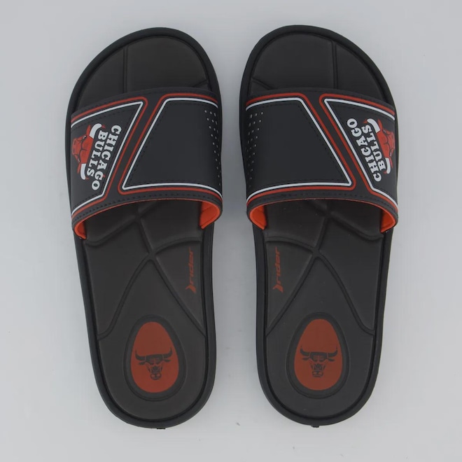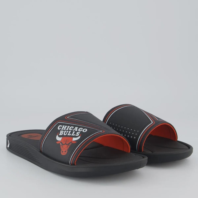 Origem: Nacional Indicado para: Casual Cor predominante: Preta Composição solado: 100% Borracha Time: Chicago Bulls Tira: Larga e única Composição tira: Material sintético Gênero: Masculino Peso aproximado: 420g o par n° 40