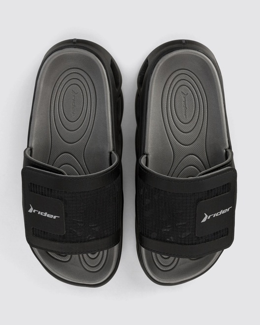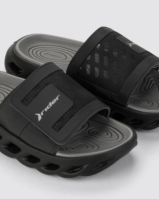 O Rider R Power Slide une tendência com tecnologia, trazendo o que há de melhor nos chinelos slides para você. O destaque desse modelo está na sola, que traz um tratorado bold, remetendo aos systems volumosos dos sneakers dos anos 2000, visual que têm mostrado força novamente no sportswear. E na parte de baixo, o play de Rider marca cada pisada com muito estilo e identidade. O R Power é o companheiro ideal para os fazedores de Rider. Além disso, a palmilha traz conformagem marcando uma pisada anatômica diferenciada e texturas que deixam o visual high tech, fazendo o complemento perfeito para a proposta moderna desse produto.
