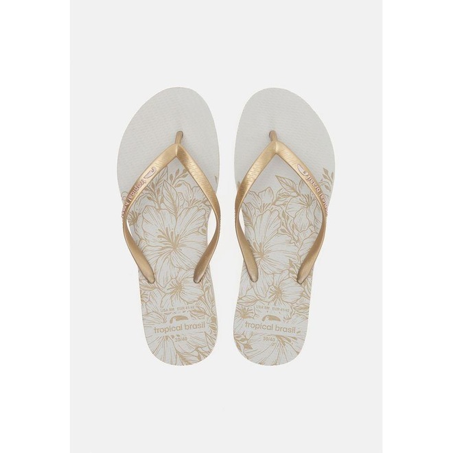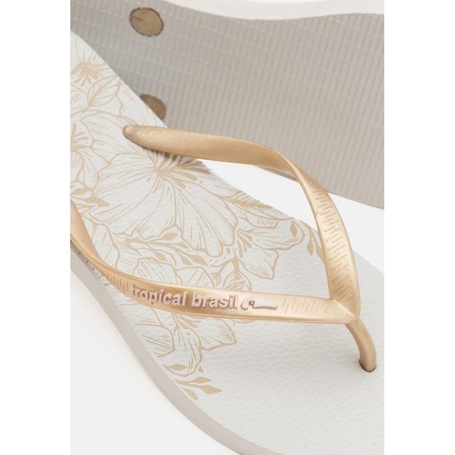 Chinelo Tropical Brasil Estampado Slim Gold Glitter com Branco - Tropical BrasilA exuberância da natureza sempre nos surpreende, e você encontra parte dela nos Chinelos Tropical Brasil. Prepare-se para o Verão com os Chinelos Tropical, aliando conforto com estilo.