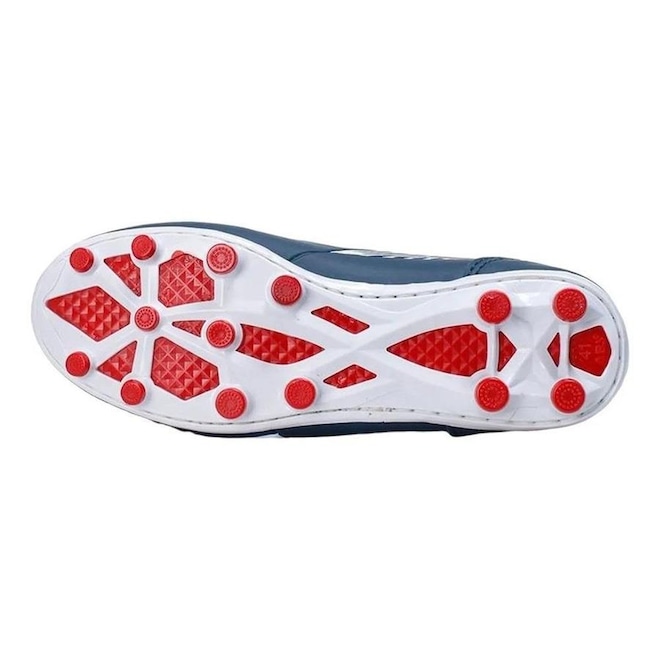 Composição cabedal: Confeccionado em sintético e PVC Palmilha: EVA Forro: Material têxtil Lingueta: Fina e flexível Solado: TPU com travas altas e fixas Ajuste: Cadarço Embalagem: Par