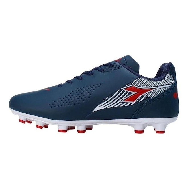 A Chuteira Diadora tem o cabedal em material sintético e PVC laminado.