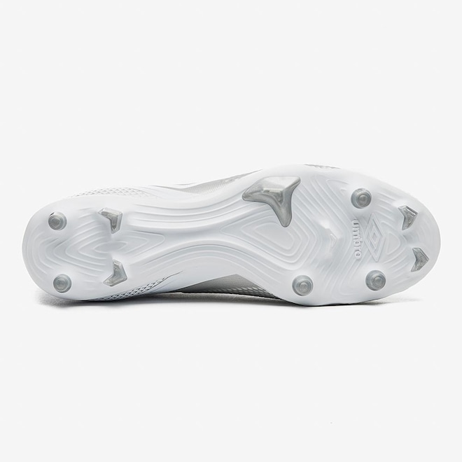 O solado de campo FG de 11 travas mistas, em TPU, oferece tração e estabilidade superiores, garantindo agilidade e segurança em campo.
