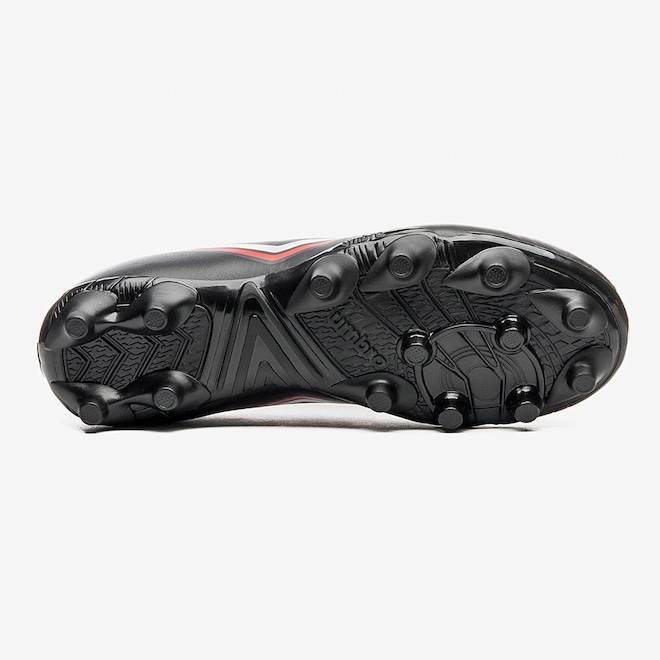 O solado de campo FG com 14 travas em PVC oferece excelente tração em diferentes tipos de terreno, proporcionando estabilidade e agilidade aos jogadores. A combinação de cores PRETO, VERMELHO e BRANCO confere um visual moderno e arrojado, destacando-se no campo e refletindo a personalidade do jogador que busca se destacar.