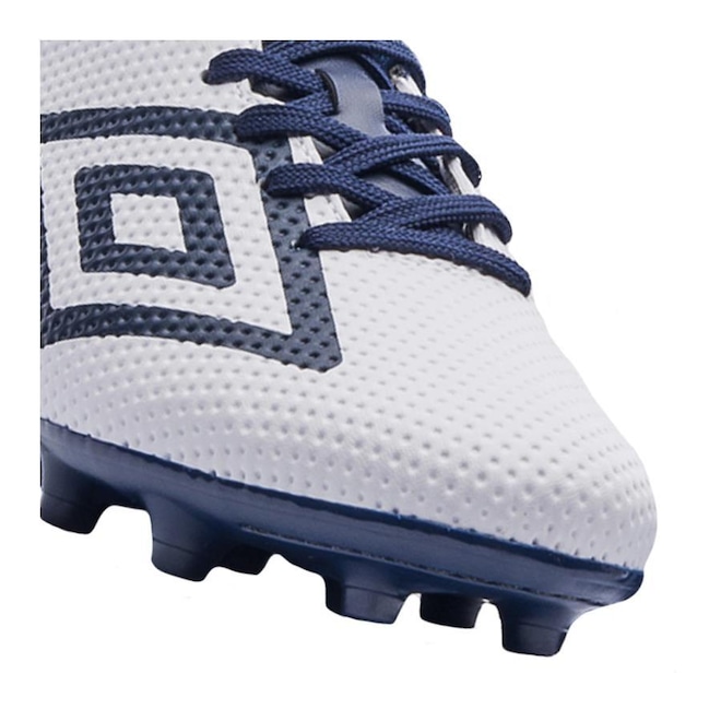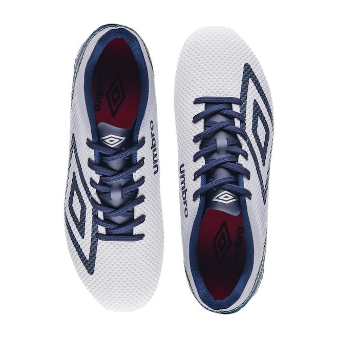 A Chuteira Campo Umbro Force exibe um design despojado com degradê e bloco de cores. Indicada para jogadores iniciantes, ela traz textura integral e entrega de grip em toda a área da gáspea, o que auxilia o controle direcional dos chutes e dribles. Cabedal assimétrico construído em material laminado com aplique em cilindro de baixo relevo, que confere textura integral e maior grip ao entrar em contato com a bola, e forro em tecido de poliéster. Possui arte gráfica em estampa perfurada, Diamante Umbro aplicado na parte frontal, assinatura do modelo estilizada na parte posterior com contraste de cores, atacador convencional e palmilha interna em EVA forrado. O solado de campo FG de 14 travas, com design minimalista, é composto por PVC e conta com costura de reforço frontal para maior durabilidade.ref: M13EDZ