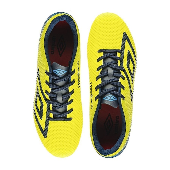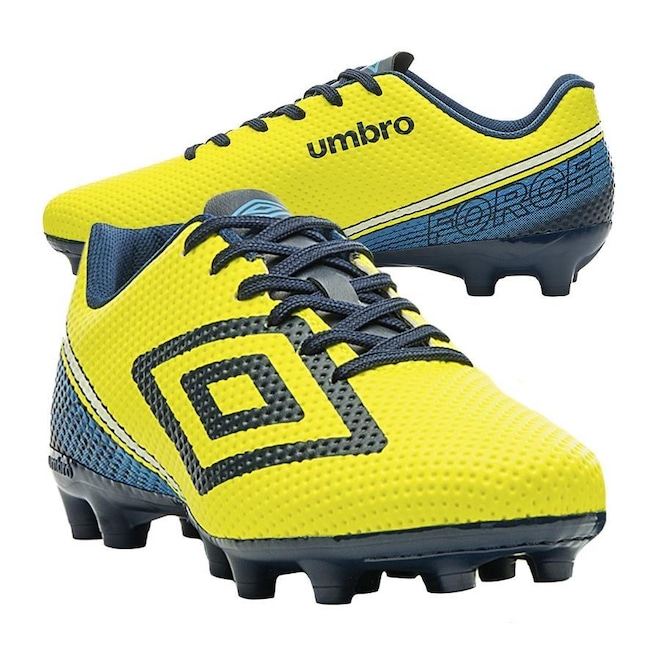 A Chuteira Campo Umbro Force exibe um design despojado com degradê e bloco de cores. Indicada para jogadores iniciantes, ela traz textura integral e entrega de grip em toda a área da gáspea, o que auxilia o controle direcional dos chutes e dribles. Cabedal assimétrico construído em material laminado com aplique em cilindro de baixo relevo, que confere textura integral e maior grip ao entrar em contato com a bola, e forro em tecido de poliéster. Possui arte gráfica em estampa perfurada, Diamante Umbro aplicado na parte frontal, assinatura do modelo estilizada na parte posterior com contraste de cores, atacador convencional e palmilha interna em EVA forrado. O solado de campo FG de 14 travas, com design minimalista, é composto por PVC e conta com costura de reforço frontal para maior durabilidade.ref: M13EDZ