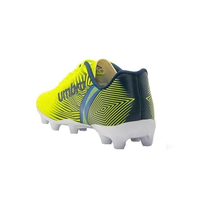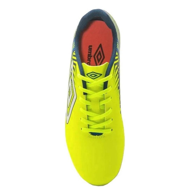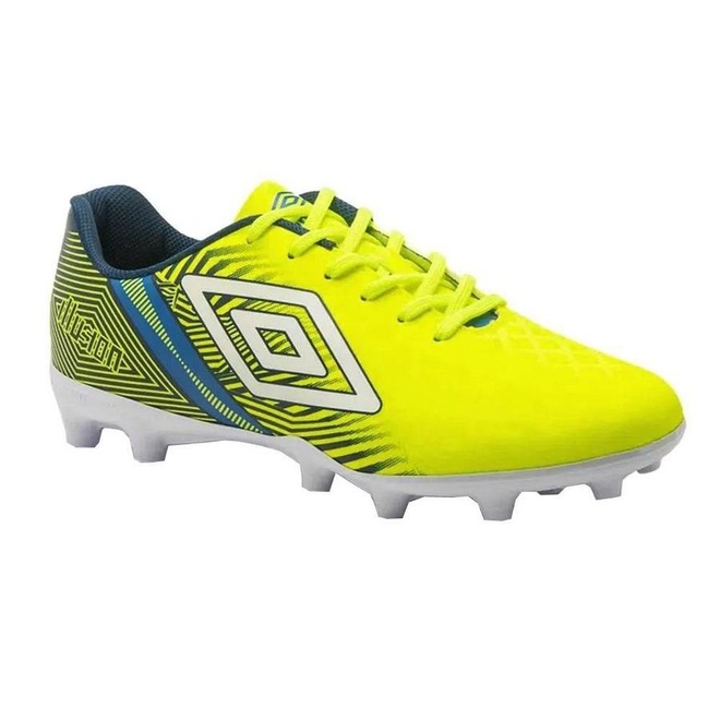 A Chuteira de Campo Umbro Illusion tem seu cabedal (parte superior do calçado) construído em material laminado e texturizado. Possui aplicação de grafismo do tipo degradê com sobreposição de três cores em serigrafia. O Diamante Umbro está em destaque. Solado de campo FG de 14 travas produzido em PVC com desenho mais minimalista e costura de reforço na parte frontal. LIMÃO,MARINHO,ref: M102PL
