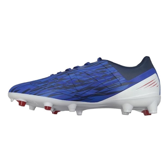 A Chuteira Campo Umbro Ultimate foi desenvolvida com inspiração nas últimas tendências do cenário futebolístico, exibindo um visual arrojado que se destaca pelas artes gráficas exclusivas com cores vivas e modernas. Indicada para jogadores iniciantes que procuram por uma chuteira estilosa para dominar o jogo em campo. Cabedal assimétrico construído em material laminado emborrachado liso, com toque macio, e detalhes em janelas de alta frequência. Possui forro traseiro em Mesh com acabamento superior luvado, grafismo camuflado geométrico em serigrafia, maxi Diamante Umbro aplicado na região frontal, assinatura do modelo na lateral externa da parte posterior e palmilha interna em EVA conformado para maior conforto. O solado de campo FG de 10 travas, com 2 travas centrais de tração, é composto por TPU com trava bicolores posicionadas.ref: M13UTP