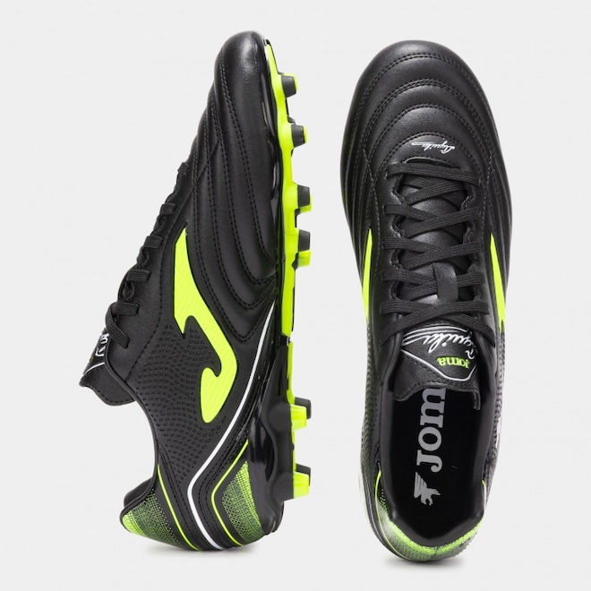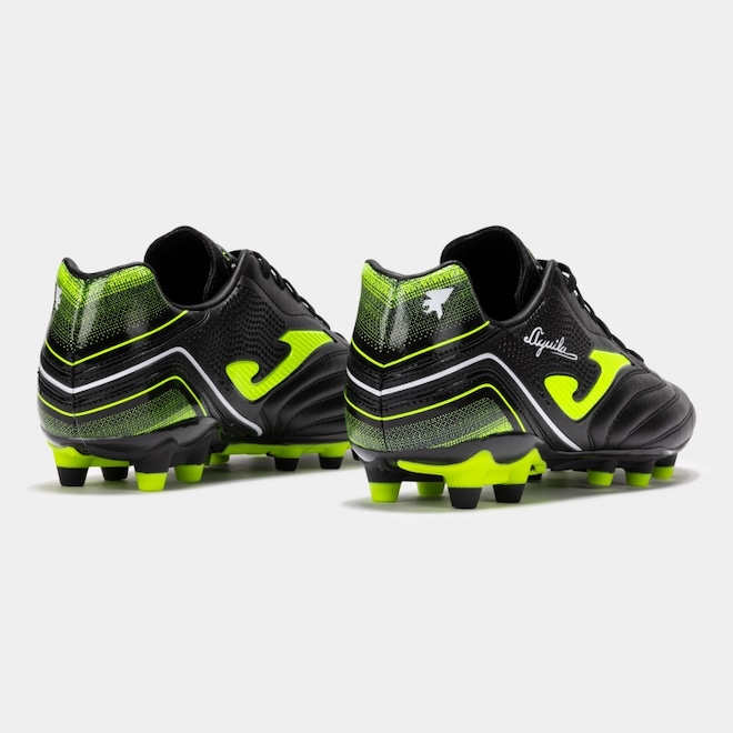 A chuteira Joma Aguila para futebol de campo tem seu cabedal feito em FIBERTEC (material sintético) para maior conforto e durabilidade, as costuras na parte frontal o contato e controle da bola, o forro interno em poliéster oferece um ambiente confortável ao pé, a palmilha em EVA liso é responsável pelo amortecimento necessário, a base tem uma peça em PVC para melhor estabilidade e as travas são em PU de alta qualidade e resistência à abrasividade. A chuteira Aguila é a melhor pedida para o jogador que procura uma chuteira clássica com a tecnologia atual!